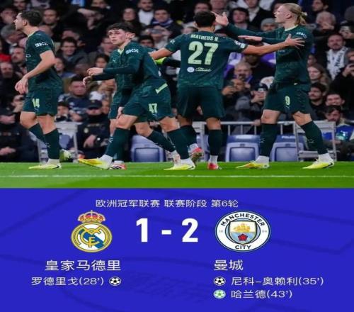 伯纳乌之夜的豪门对话堪称本轮重头戏。皇马虽在控球和射门次数上占优,却因效率低下而1-2不敌曼城。上半场,罗德里戈为皇马首开纪录,但曼城迅速由奥赖利和哈兰德连入两球完成反超。下半场皇马猛攻无果,恩德里克击中立柱。曼城8次射正打入2球,高效的终结能力是取胜关键,皇马则遭遇两连败。