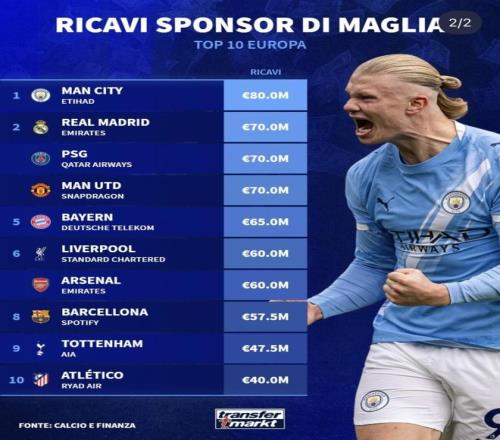 另一点是联赛层面的“集体缺位”。欧洲赞助收入前十里,英超占了四个席位,西甲、德甲、法甲也都有代表,唯独没有意甲俱乐部。哪怕AC米兰、国际米兰这几年战绩和话题度都有回暖,在商业开发上依然追不上同级别的英超和西甲豪门。整体来看,目前球衣主赞助的盘子更多是被英超和少数几家超级豪门吃走,意甲只能在内部做分配,很难真正分享那一层级的商业红利。